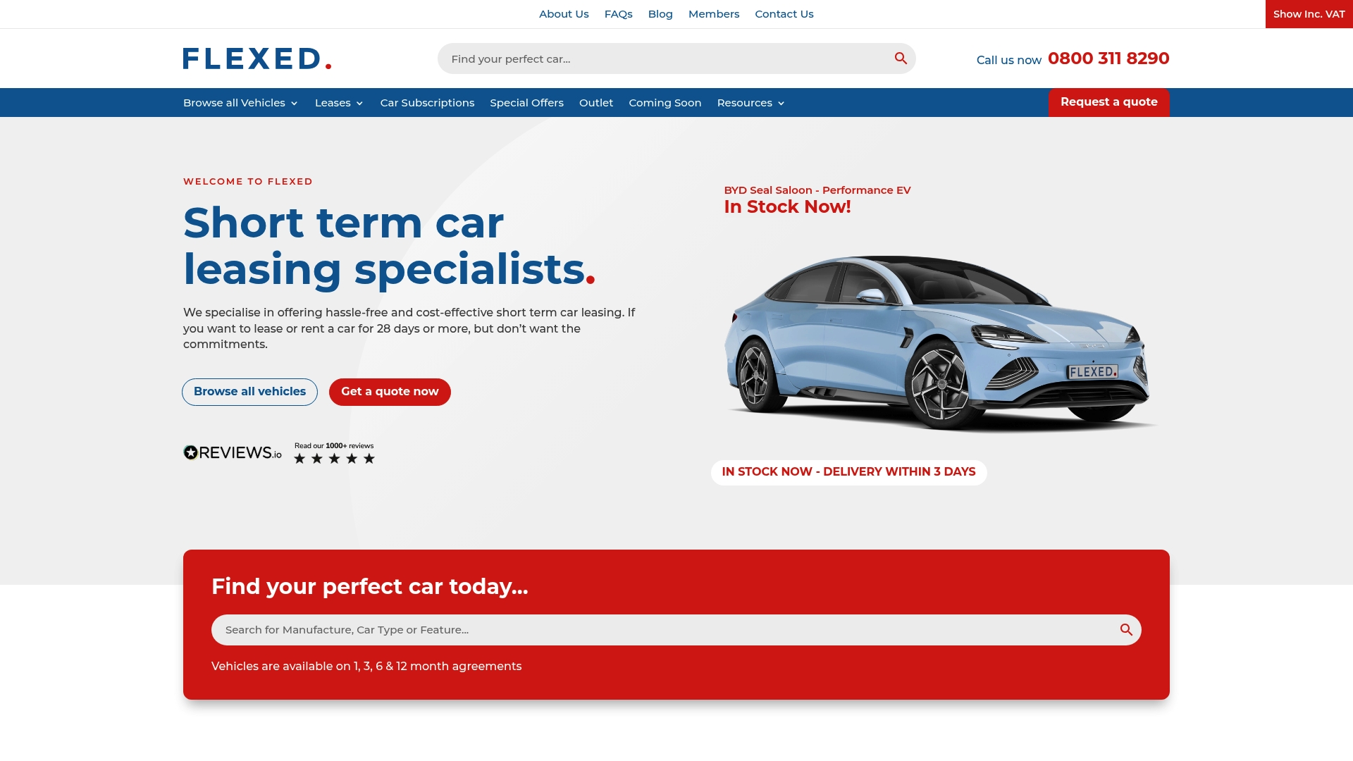 Flexed provides 28 days to 12 months leasing with a wide selection of quality vehicles across multiple manufacturers and categories. They advertise next day availability for in stock cars and include maintenance and roadside assistance as standard in many packages.