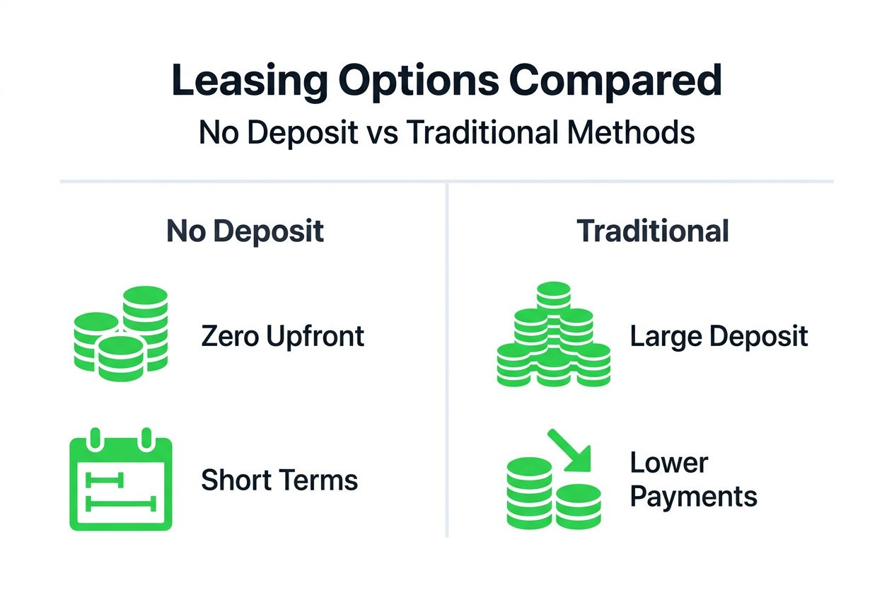 Understanding how no deposit leasing differs from traditional leasing and hire purchase helps you choose the right option for your circumstances. Each method carries distinct advantages and trade-offs that affect your cash flow, credit impact, and long-term costs.